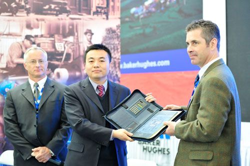 貝克休斯北亞區(qū)技術(shù)支持總經(jīng)理Ian Ayling(右一)、貝克休斯副總裁Freitag, Hans-Christian(左一)向cippe石油展主辦方代表北京振威展覽有限公司副總經(jīng)理賈鵬洲贈送禮物