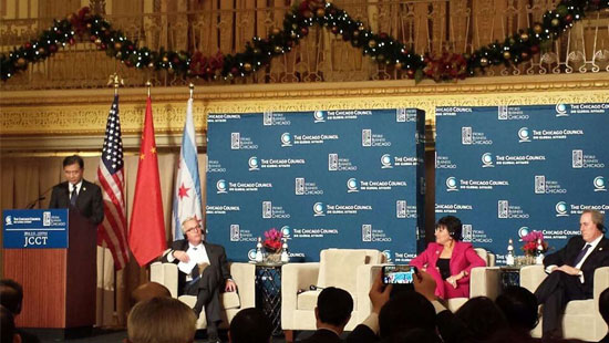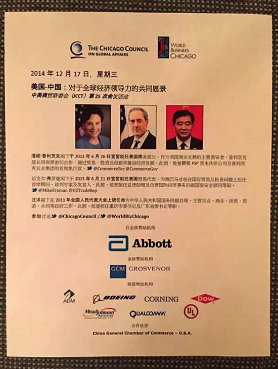 12月16日至18日,第25屆中美商貿(mào)聯(lián)委會會議在美國芝加哥舉行,中國國務(wù)院副總理汪洋與美國商務(wù)部長普利茲克、貿(mào)易代表弗羅曼共同主持會議。