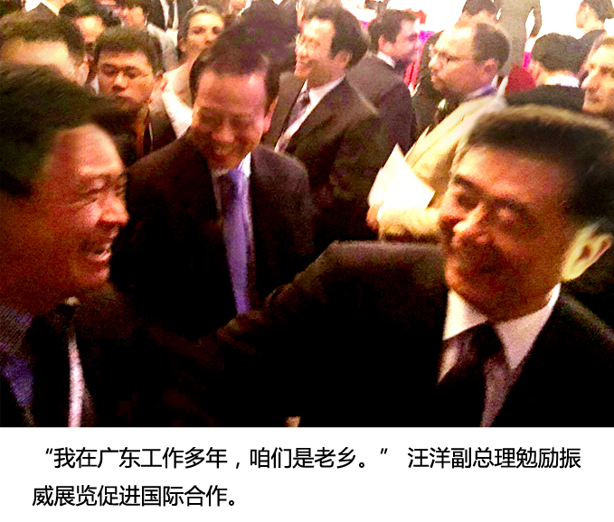 會(huì)后汪洋副總理接見(jiàn)了中紡集團(tuán)、北京首都農(nóng)業(yè)集團(tuán)、振威展覽集團(tuán)等企業(yè)代表。當(dāng)與代表們親切握手時(shí),聽(tīng)說(shuō)振威展覽集團(tuán)總經(jīng)理張學(xué)山來(lái)自廣東省,汪洋副總理風(fēng)趣的說(shuō),那我們算是老鄉(xiāng)了,我在廣東工作過(guò)多年,希望展會(huì)在國(guó)際交流與貿(mào)易合作中,起到橋梁和紐帶作用。