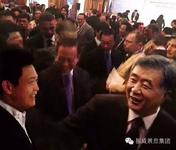 2015米蘭世博會中國國家館日活動(dòng)期間,中國國務(wù)院副總理汪洋與振威展覽股份董事長張學(xué)山親切交談