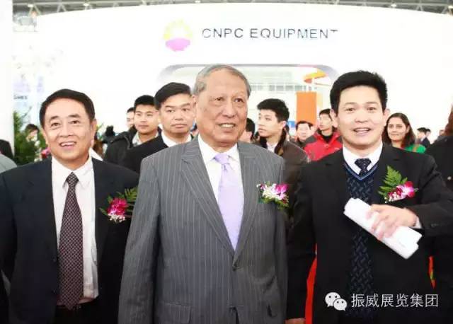 振威展覽股份董事長張學(xué)山陪同第九屆、十屆全國人大常委會副委員長成思危(中),中國工程院院士、中國海 洋石油有限公司原總裁周守為(左一)參觀cippe振威國際石油展