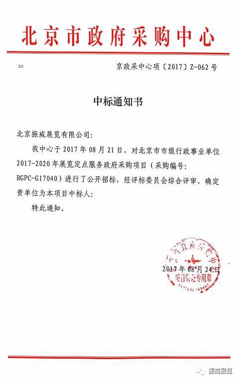 通過層層考核,經(jīng)北京市政府采購中心評標委員會專業(yè)評審,北京振威于2017年8月24日接到《中標通知書》,成為北京市市級行政事業(yè)單位2017-2020年展覽定點服務(wù)政府采購項目中標單位。